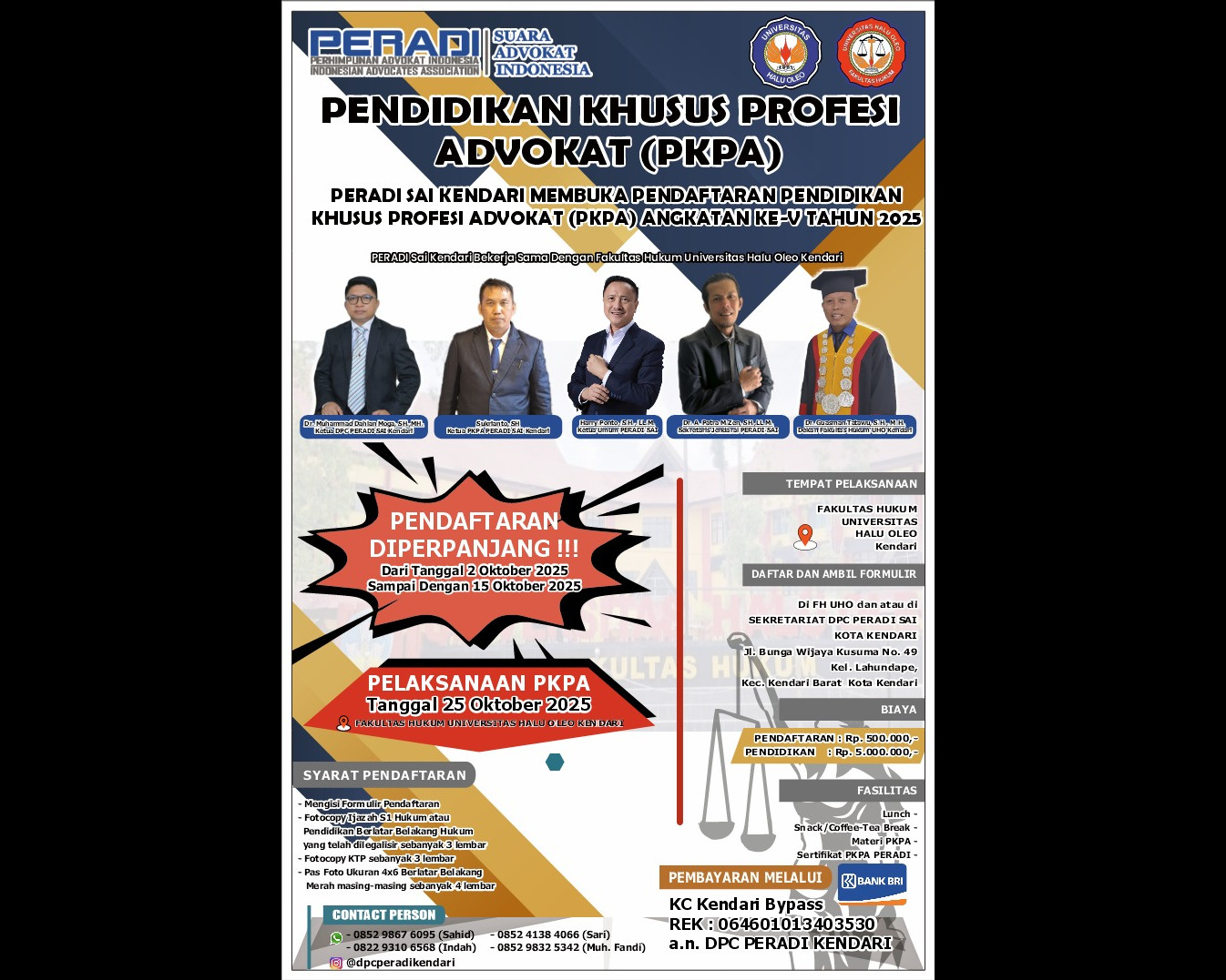 PERADI - 21 Oct 2025Pendidikan Khusus Profesi Advokat (PKPA) Angkatan V Tahun 2025, PERADI SAI Kendari bekerja sama dengan Fakultas Hukum Universitas Halu Oleo Kendari membuka pendaftaran Pendidikan Khusus Profesi Advokat (PKPA).