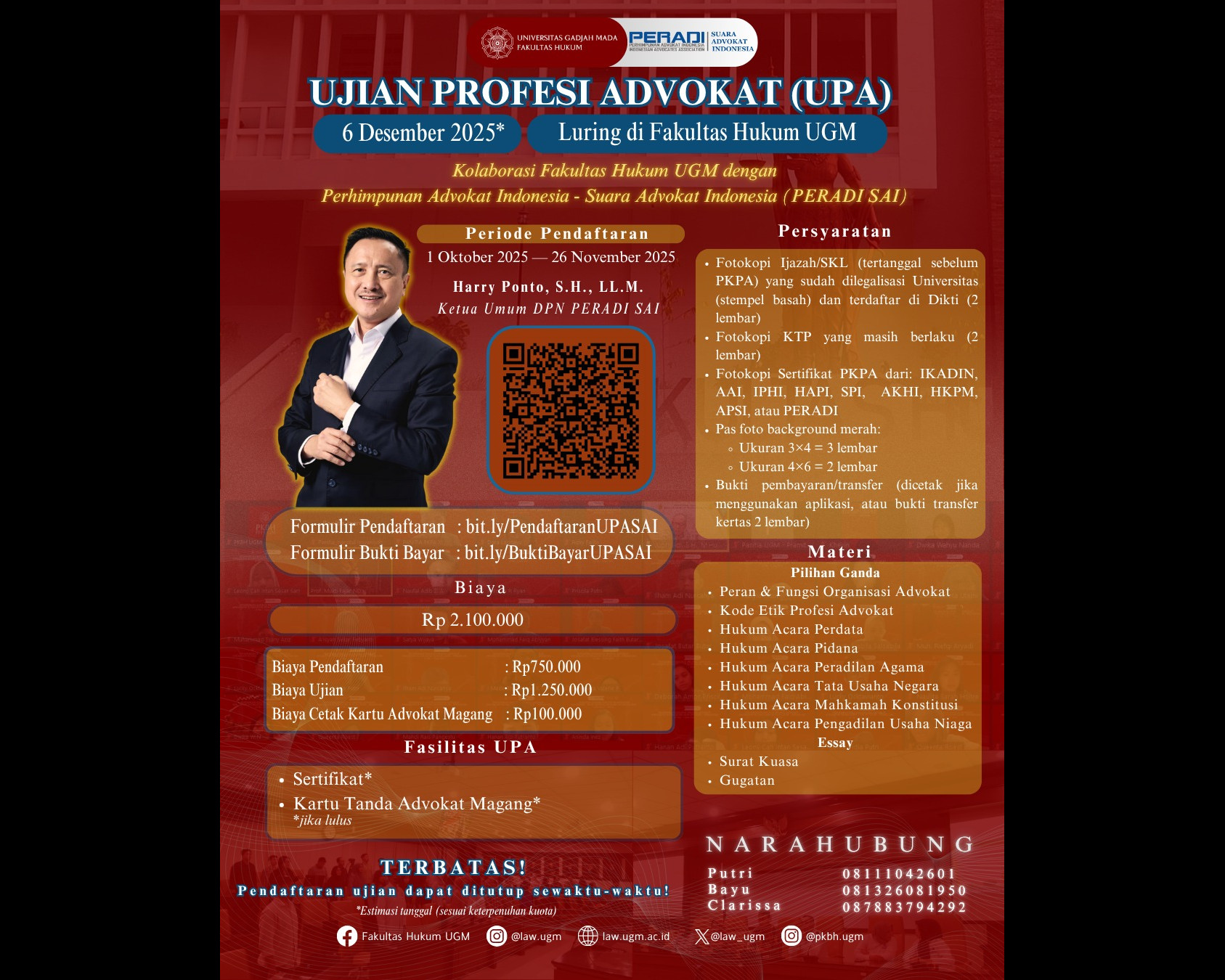 Segera daftarkan diri Anda dan manfaatkan peluang ini sebagai landasan kuat menjadi advokat profesional!